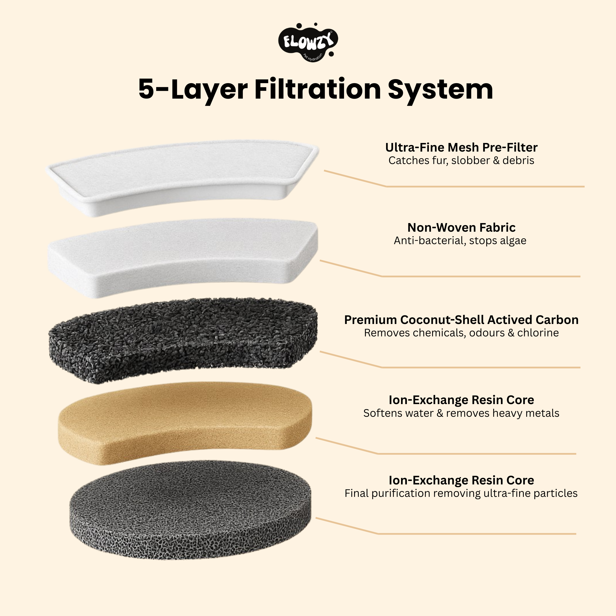 Flowzy’s advanced 5-Layer Filtration System removes everything your dog shouldn’t be drinking — from fur and dust to chemicals and heavy metals.